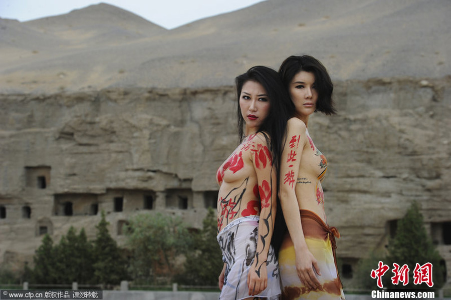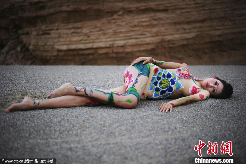 2013年6月4日,甘肃省酒泉市,IBC公益志愿者在敦煌雅丹地貌拍摄“沙裸艺术”。意在以敦煌莫高窟为起点,呼吁全社会关注文化生态保护问题,重新审视人与自然和谐共生的深远意义。朱熙勇 摄 图片来源:CFP视觉中国