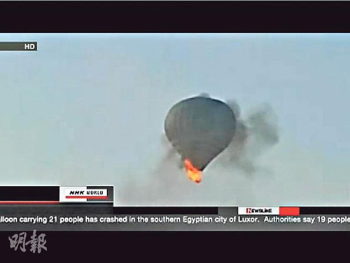 意外于2月26日发生,埃及著名旅游区卢克索一个载有20多人的观光热气球起火坠毁,酿19死2伤,其中9名死者是中国香港游客,当地热气球观光活动一度暂停。