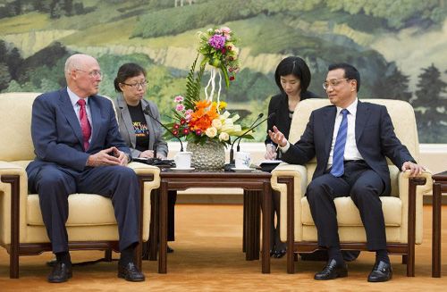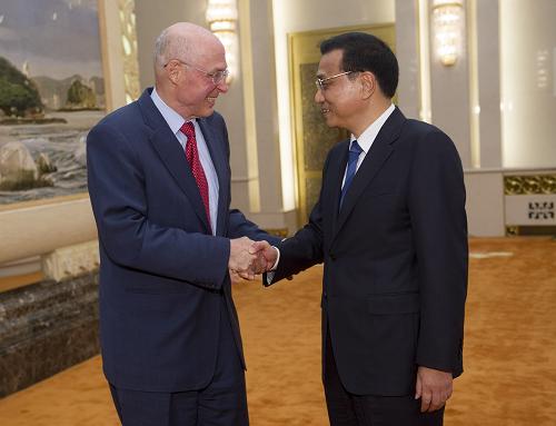6月5日,国务院总理李克强在北京人民大会堂会见美国前财长保尔森。新华社记者 黄敬文 摄