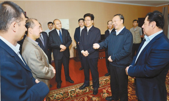 6月7日,张春贤陪同杜青林在新疆伊斯兰教经文学校考察时,向老师了解学校办学及爱国宗教人士培养等情况。本报记者李杨摄