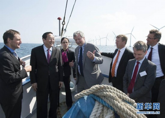 6月7日,中国全国政协主席俞正声在丹麦哥本哈根参观米德尔格伦登风电场。