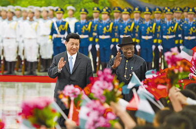7月10日,国家主席习近平在北京人民大会堂同尼日利亚总统乔纳森举行会谈。这是会谈前,习近平在人民大会堂北大厅为乔纳森举行欢迎仪式。