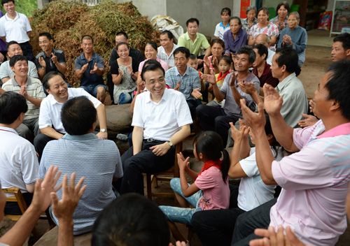 7月8日至10日,中共中央政治局常委、国务院总理李克强到广西北海、钦州、南宁考察。这是7月9日在南宁坛良村村口大榕树下李克强和村民们在一起。