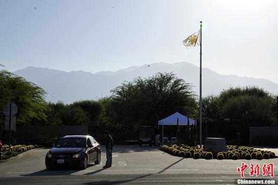 当地时间6月5日,美国加州安纳伯格庄园关门谢客,准备迎接即将在这里举行的中美领导人会晤。图为当地媒体在庄园门外进行现场报道。中新社发 毛建军 摄