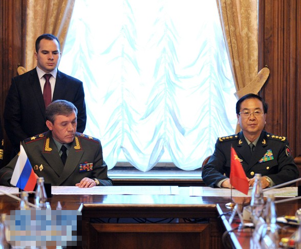 7月1日,正在俄罗斯进行正式访问的中央军委委员、总参谋长房峰辉上将(右)与俄罗斯武装力量总参谋长格拉西莫夫大将(左前)在莫斯科共同批准了中俄两军联合演习文件,并宣布了举行联合军演的决定。中国和俄罗斯军方将于7月5日至12日在日本海彼得大帝湾举行“海上联合-2013”中俄海上联合军演,7月27日至8月15日在俄罗斯车里雅宾斯克举行“和平使命-2013”中俄联合反恐军演。