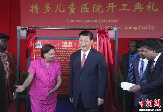当地时间6月1日下午,正在这里进行国事访问的中国国家主席习近平在特立尼达和多巴哥总理比塞萨尔陪同下,来到特多中部城市库瓦,出席中国公司承建的库瓦儿童医院开工典礼。习近平和比塞萨尔一同为项目揭牌,并亲切慰问两国施工人员。习近平勉励中方建设者按期保质完成好项目,使其成为中特友好新的象征。中新社发 张朔 摄