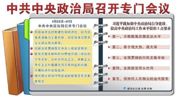 6月22日至25日,中共中央政治局召开专门会议,围绕保持党的先进性和纯洁性,以为民务实清廉为主要内容,切实加强马克思主义群众观点教育;回顾总结贯彻落实中央八项规定情况;联系思想实际和所分管地方部门单位的工作实际,分析在形式主义、官僚主义、享乐主义和奢靡之风方面存在的问题,开展批评和自我批评;研究提出加强作风建设的措施及有关制度规定。