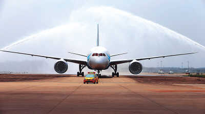 波音787梦想飞机穿过水门,标志其正式加入南航机队。罗广泰摄
