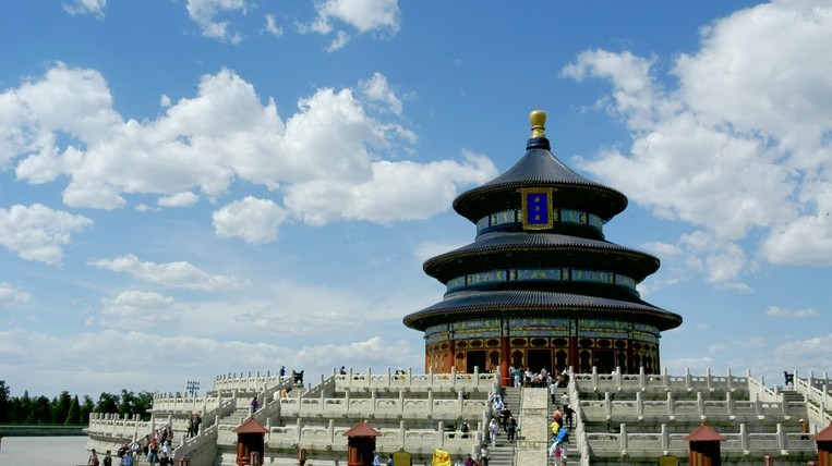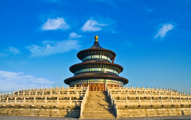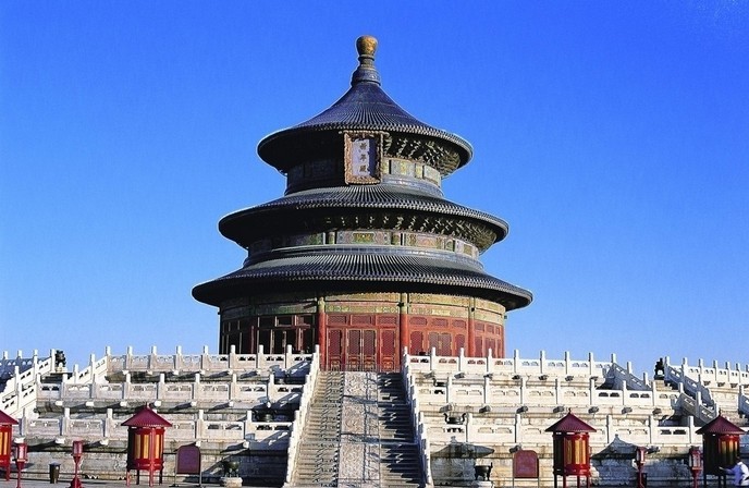 在整个北京城里,北有地坛祭地,南有天坛祭天,东有日坛祭太阳,西有月坛祭月亮,其中天坛最为光彩夺目、气宇非凡。天坛始建于明永乐十八年(1420年),清乾隆、光绪时曾重修改建。为明、清两代帝王祭祀皇天、祈五谷丰登之场所。天坛是圜丘、祈谷两坛的总称,有坛墙两重,形成内外坛,坛墙南方北圆,象征天圆地方。主要建筑在内坛,圜丘坛在南、祈谷坛在北,二坛同在一条南北轴线上,中间有墙相隔。圜丘坛内主要建筑有圜丘坛、皇穹宇等等,祈谷坛内主要建筑有祈年殿、皇乾殿、祈年门等。著名的祈年殿在最北方,这是天坛内最宏伟、最华丽的建筑,也是想象中离天最近的地方。祈年殿的上下三层屋顶,均用深兰色琉璃瓦铺盖,象征天色。(国域网 覃浩编辑)