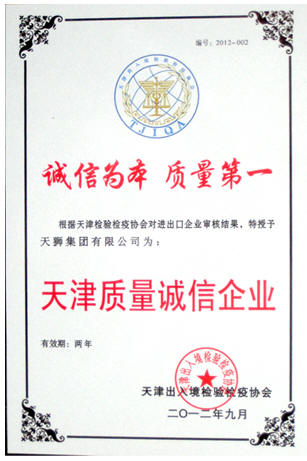 2013年6月5日,天津出入境检验检疫协会在武清开发区管委会,隆重召开了2013年武清区进出口诚信企业创建推动表彰会,天狮集团等四家企业被授予了“质量诚信企业”的荣誉称号。