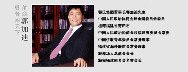 郭氏投资集团有限公司创建于1989年,二十几年来,郭氏集团坚持“团结奋斗、创新进取、奉献社会”的企业精神,遵循“以市场为导向、以质量求生存、以科技求发展”的经营方针,紧跟时代步伐,充分利用政策及市场区域等优势,凭借自身的灵活机制,依托雄厚的资金实力,依靠人力资源对事业的执着追求,在激烈的市场竞争中奋力拼博,脱颖而出,取得了跨越式的发展。经过二十几年的努力,郭氏集团从单一从事国际贸易发展到房地产开发、酒店、化工科技等多元化领域,实体遍布欧洲、美国、上海、北京、福建等地。公司总资产六十亿元人民币。郭氏集团在壮大发展的同时,积极回报社会,董事长郭加迪先生荣获福建省十大红十字爱心公益人物。