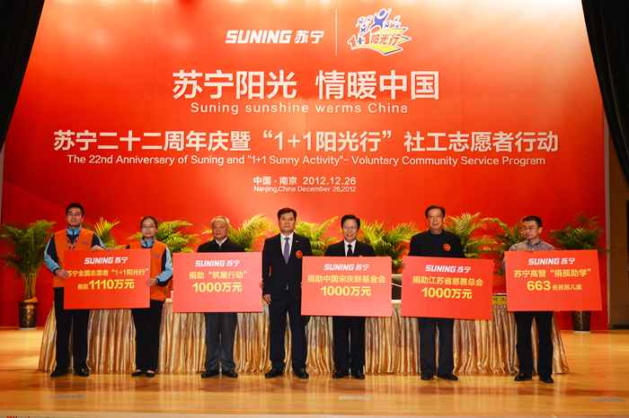 2011年12月26日21周年司庆日,苏宁携手中国扶贫基金会、上海真爱梦想公益基金会发起了“苏宁•筑巢行动”、“苏宁•溪桥工程”、“苏宁阳光梦想中心”三大公益项目。
