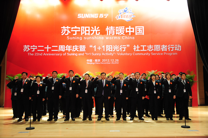 苏宁将企业的社会责任与员工的社会责任相结合。2006年建立了中国首个由企业发起的社工服务制度——“1+1阳光行— 苏宁社工志愿者行动”,号召全体员工每人每年捐出1天工资用于慈善捐赠,奉献1天时间参加社工服务。目前已经成立了1000多支社工服务队,形成了3、4月植树活动,5、6月服务中高考考生及家长,12月以“冬季送温暖”等年度定期开展的公益活动。截止目前,苏宁在抗击灾害、扶贫救弱、捐赠教育、环境保护等四大领域累计捐赠达8亿多元,实现了公益活动长期化、长期化执行。