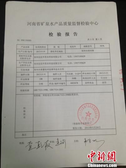 5月14日,中新网以《探访郑州桶装水生产环境:散布污水脏衣物》为题,对郑州市金水区的4家桶装水生产加工单位给予了报道。随后郑州市质监局对报道中涉及的4家企业产品抽样检验。5日,郑州市质监局向中新网通报称,在抽检的4家企业桶装水样品中,3家企业合格,其中一家检验结果尚未出来。