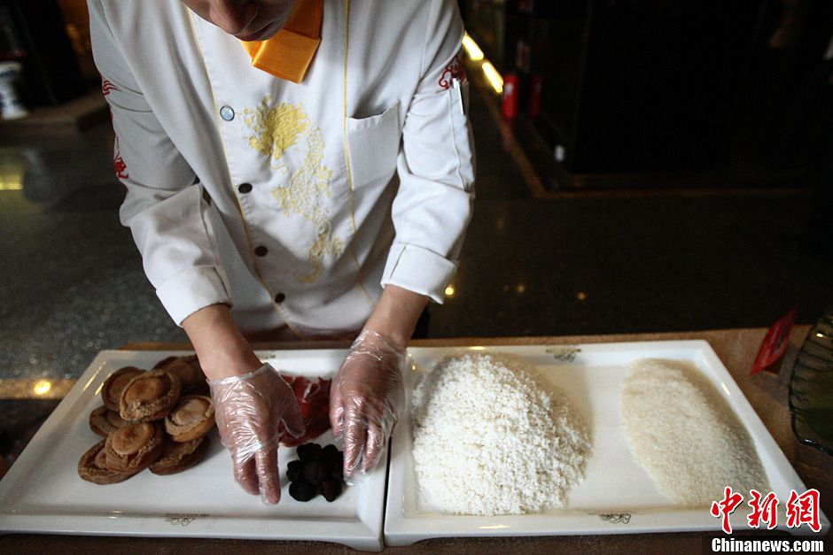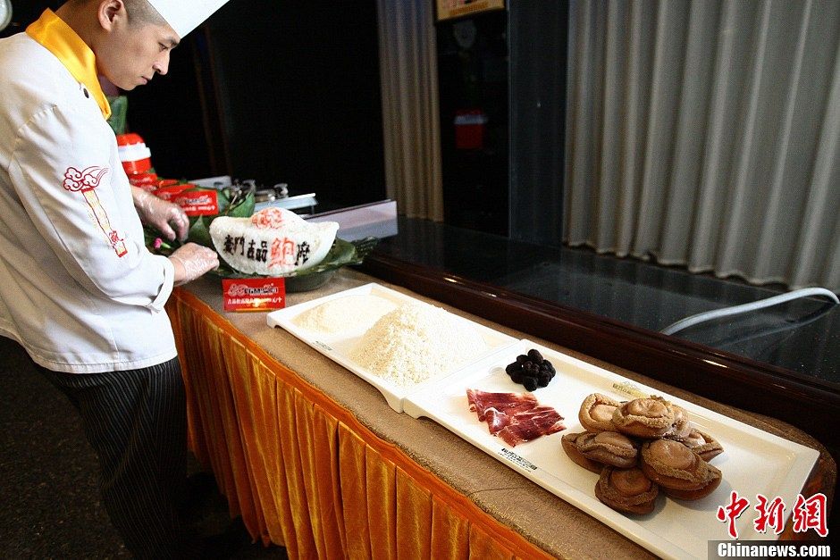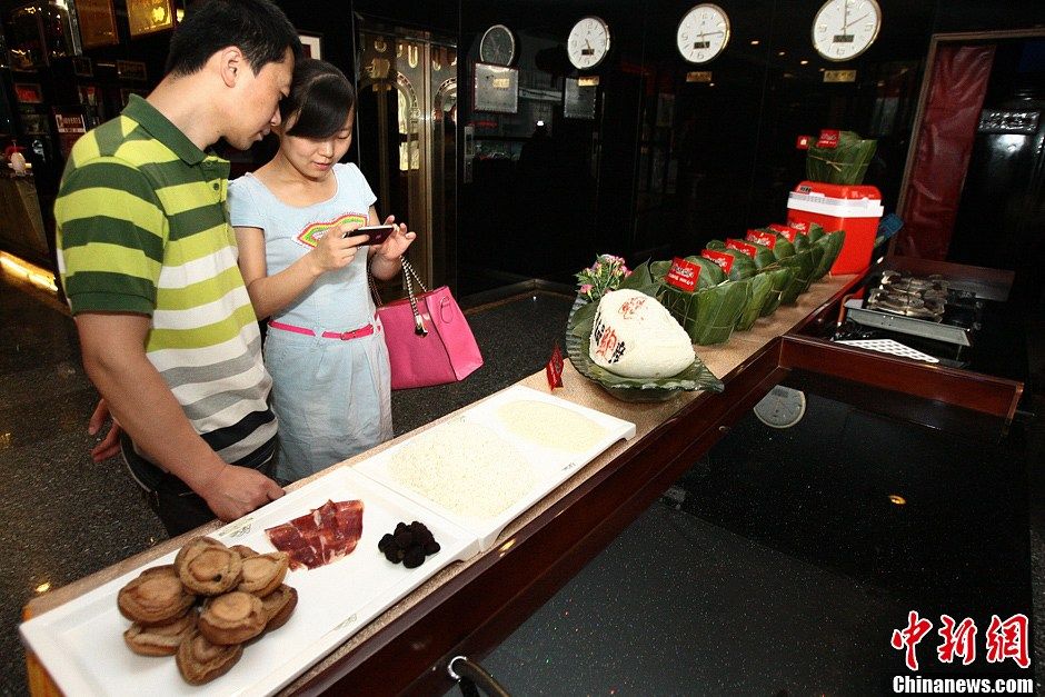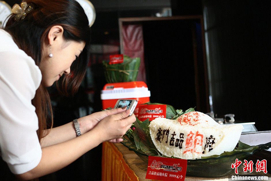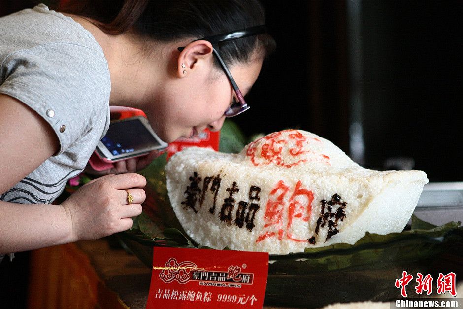 6月6日,在太原长治路一家饭店内,一枚宛如白玉元宝的粽子标价9999元。据商家介绍,该粽子采用吉品鲍鱼、黑松露、西班牙火腿等多种进口珍贵食材精制而成,所以售价高达9999元,且必须预订方可购买。