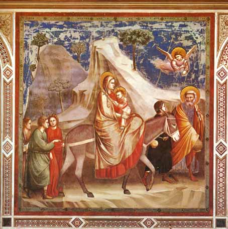 《圣经》中说,东方三博士得知人类未来的救世主耶稣诞生,即前往耶路撒冷朝拜,以色列希律王得知后甚为恐惧,立即下令将耶稣诞生地的伯利恒地区所有男婴全部杀死,借以灭掉耶稣根除后患。上帝托梦于耶稣义父约瑟,赶快将圣母玛利亚和刚出生的耶稣带往邻国埃及避难,乔托描绘的正是这一情节。在这幅画中乔托完全抛弃了中世纪的清规戒律,画中人物有着健壮而结实的身体,充满世俗的人情意味。我们所见情景,就是现实生活中的母亲抱着孩子骑在驴背上,在丈夫引导下和同路人在乡间山道上行进,这是一幅活生生的世俗画面。画家把神请到了人间,将神变成人。