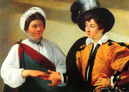 《占卜者》是卡拉瓦乔早期风俗画的代表作品,画中描绘的是流浪的吉普赛女占卜,在为一个贵族子弟看手相。这是一个街头常见的风俗场面,人物形象目光相对,那个头戴羽帽的贵族青年以轻蔑挑逗的目光看着女占卜者,而她虽地位低下,却显得庄重自尊,回敬的目光中既真诚又含智慧,对比之下,贵族青年却显出华而不实的肤浅。社会底层的流浪人第一次作为主人走进绘画,这在意大利以往的绘画中还不曾见过。