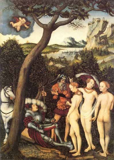 克拉内赫在这幅画中所描绘的与传统画法不一样,他将帕里斯画成一位中世纪的骑士,一个禁欲主义者为美人所动心,中间老者是赫耳墨斯。三位女神在帕里斯面前各显绝技,实际上所描绘的是骑士英雄和妩媚美人,它是中世纪的禁欲主义和文艺复兴人性开放的矛盾反映。