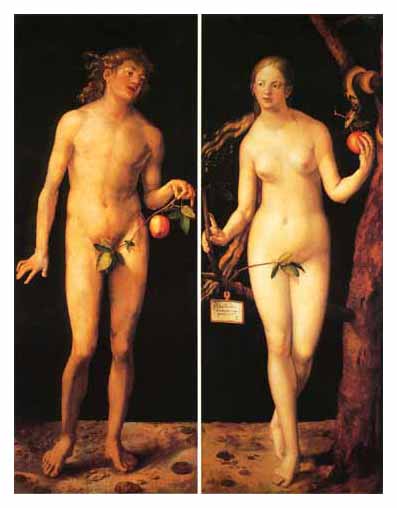 丢勒游历艺术之邦意大利最大的收获,是对人体艺术的兴趣,自27岁以后,他曾竭尽全力去探索男女人体的完美比例,从古代希腊人体艺术中悟到了真谛,并融化于自己的人体艺术创造之中。《亚当与夏娃》采用祭坛屏板的样式,将亚当与夏娃分别画在两块竖板面上,人物形象顶天立地充满画面空间,形成独立的两幅男女裸体像。