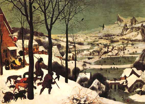 这是一幅深远的有人物活动的风景画,画家似乎是站在山顶上看着山下的猎人,透过猎人远视全景。山坡和地平线都以对角线形式交叉组合画面,从而构成伸向低谷的变化多端的斜坡。由于恰当的远近透视处理,使画面具有深远的空间感和空气感。画家基本上是采用黑白灰色调的对比塑造自然、人物、空气和光,给人以寒冷且透明的感觉。凡熟悉欧洲地理环境的人都认为,画家所描绘的正是尼德兰地形的特殊风貌及其美丽的容姿。勃鲁盖尔对大自然的深情描绘,使他成为尼德兰民族现实主义风景画的创始人。