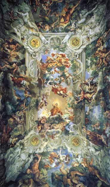 《众神》又名《乌尔班八世的赞颂》,作于罗马巴尔贝利尼宫天顶壁面。乌尔班八世是罗马教皇,在位时一心想扑灭各地的新教势力,积聚财力,扩充军力,大兴土木,赞助艺术事业。巴尔贝利尼宫天顶画,实质上是一幅极尽浩繁富丽的歌功颂德性质的壁画。天顶画上所有升腾飞翔着的人物,都呈一种向心的纵角透视,朝着天顶中央的方向奔去。人物的锦缎华装衣褶飘逸轻忽,如天风吹拂,画中人物配置有聚有散,博大精深、宏伟壮丽,画面色彩冷暖对比鲜明,显得富丽堂皇,全面显示出巴洛克的艺术特征:充满激烈的运动和激情,饱含神秘与奇幻的意境,艳丽豪华无与伦比。