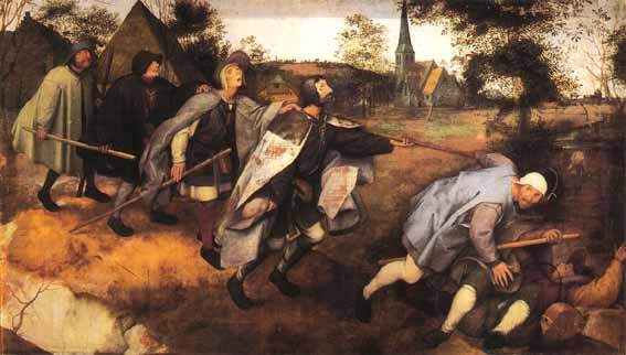 在圣经故事中,耶稣对法利赛人说:“他们是瞎眼领路;若使盲人领盲人,二者必皆落入坑中。”尼德兰民间谚语也说:瞎子牵瞎子,一起倒霉。一队富有个性和自以为是的瞎子,毫不怀疑的搭肩而行,可是盲人一无所见,还是执着地盲目地走着自己的人生之路,只要为首的一个倒下,后面的一群都必将落入坑中,由于他们弄不清究竟是谁之过,也只好互相埋怨了事,这是画家对人类命运发出的一个警告:一个国家、一个民族决不能由盲人来引路,否则必遭大难。