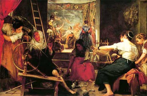 这幅画是根据神话传说《变形记》创作而成。古时有位凡女阿涅克剌发明了纺纱织布,这使智慧女神雅典娜十分恼火,一气之下就把这位聪明的少女变为蜘蛛精。上帝甚感不公平,又将少女恢复原来的美貌与智慧,而将雅典娜变为丑老太婆。实际上是画家借题描绘了西班牙皇家壁毯工场的女工劳动场景。前景人物置于暗处,背景明亮,形成鲜明对比,在背光暗处的人物又以聚光来突出,形成不同的视觉层次。一束光线照在画面右边身着白色衬衣、深蓝色裙子的那位阿涅克剌再生的女工,她是欧洲绘画中描绘女工最完美的典型。