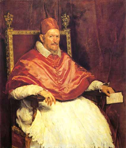 委拉斯开兹在罗马停留期间,受到教皇伊诺森西奥十世的热诚欢迎,画家为教皇画了肖像以表达感激之情。为了再现教皇的个性和权威,画家充分发挥了色彩的表现力:火红的上衣与白色的长袍形成纯净热烈的对比,更衬托出人物面部与手部的光彩;华贵的服饰显现出柔软的质感,在光的照射下闪烁着耀眼的光芒。尽管画家想赞颂教皇,可是他那现实主义的手法却无法美化教皇,呈现在大众面前的是专横跋扈、阴险狠毒、内在空虚而外表自负的教皇形象。