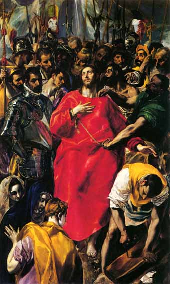 耶稣被捕后受到严刑拷打,罗马帝国地方行政长官判他死刑。为了讽刺他想当犹太王,就用荆棘为他编制了一顶王冠戴上,又脱去他的衣服换上一件国王穿的紫红色长袍,示众后钉死在十字架上。画中色彩安排很讲究,紫红色、银色、绿色、白色和黄色交混在一起,灿烂夺目,然而极不协调。画面产生的光感效果是激荡不安的。此画既继承了威尼斯画派的传统,又形成了自己的新风格。它是画家由意大利风格向自己独特风格转变的标志。