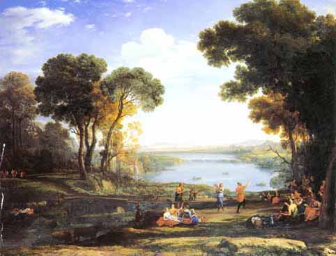 洛兰在绘画上的才能可以说是无师自通,他没有受过教育,所以说他既非科班又非文人的画家,然而这位画匠是一位天才的抒情大师,近代文明的伟大诗人。我们可窥见到洛兰的艺术真谛:画面地平线压得很低,从天际放射出光芒,河水滋养着农田,两岸古木参天,背光处浓阴馥郁,芳草留香,在天空逆光的照射下,更衬托出天水的光明。休息的农人们在河岸上欢快地舞蹈嬉戏,这些点缀性的人物,使画面深远辽阔。由于舞者的欢乐而使宁静的大自然充满生命的活力,实在是一首田园抒情诗篇。