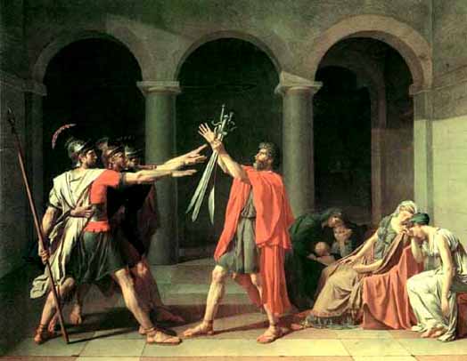 故事写的是罗马城和阿尔贝城之间发生战争,画面所描绘的是贺拉斯三兄弟向代表罗马王的父亲老贺拉斯宣誓效忠祖国的庄严场面。构图以老贺拉斯为中心,其他人物分列两边成视觉对称式均衡。老贺拉斯高举宝剑,三个儿子伸出有力的手臂作接纳状,人们手脚相对;在老人身后是一组陷入悲痛的女子,她们低首相依、无可奈何。人物的动势和组合都以直线和金字塔式构成,造成视觉上的单纯、沉着、稳定和强健的冲击力,全部人物被置于罗马圆柱式建筑大厅,这更增加了画面庄严神圣的气氛。