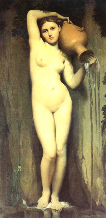 安格尔一生追求和表现理想美,十分迷恋于描绘女性人体,在他的笔下,每个人体都画得圆润细腻,健康柔美。《泉》是安格尔众多人体艺术中最杰出的一幅,少女的造型在整体上是遵循古希腊雕刻的原则,但更为细腻微妙。安格尔把他心中长期积淀的古典美与写实的现实美完美地结合了起来。这幅画的奥秘在于画家表现了人体姿态从不平衡向平衡的变化,抓住了人体内部力的微妙关系,即左倾斜的双肩和向右倾斜的胯部、向上的用力和向下倾倒的水罐,前趋的右膝和后绷的左腿都体现了力而打破了平衡。
