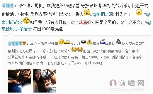 “真心不想自己开车,闯红灯、超速、鸣喇叭,烦人交规!在泉州这几天被罚了1000多元还扣2分!现想在泉州聘司机一名,要求普通话标准,车龄5年以上,阳光健康,薪资每日1000元,驾驶汽车均为自动挡车型,如宾利欧陆、宝马745、奔驰S600等。”